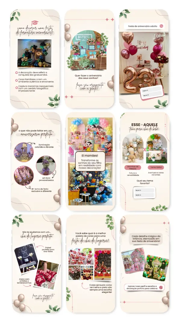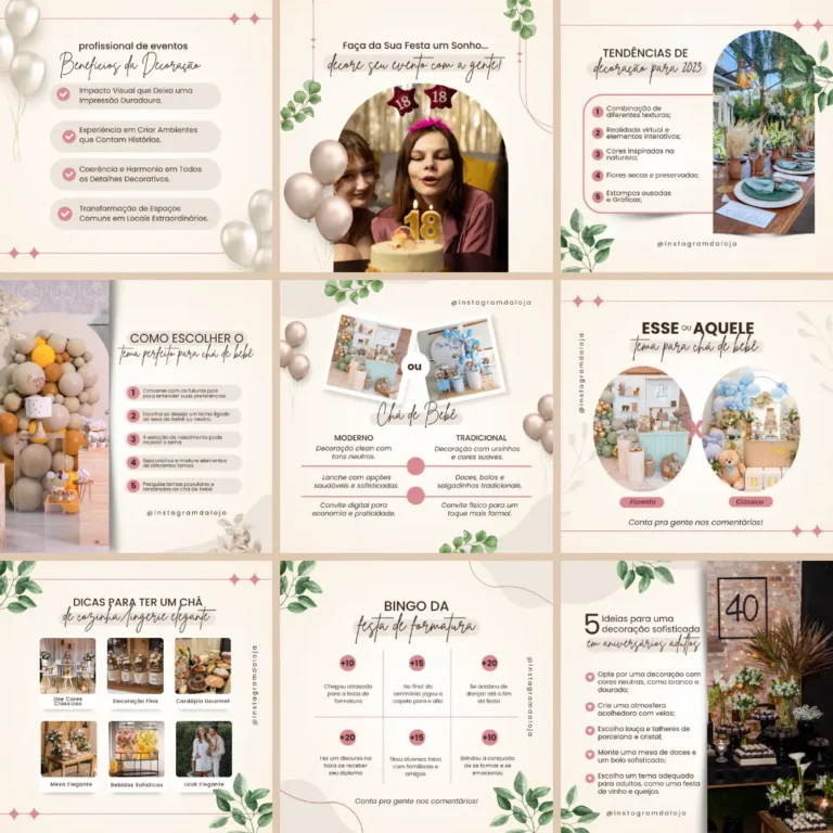 80 posts profissionais Feed para divulgar seu perfil, compartilhar informações sobre decoração de festas e atrair mais clientes