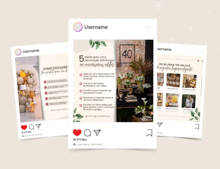 Em apenas alguns minutos você vai ter um perfil profissional com + 100 POSTS PRONTOS para divulgar seu trabalho de decoração de eventos no Instagram